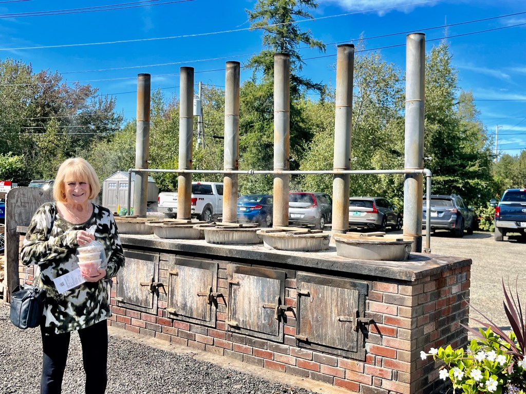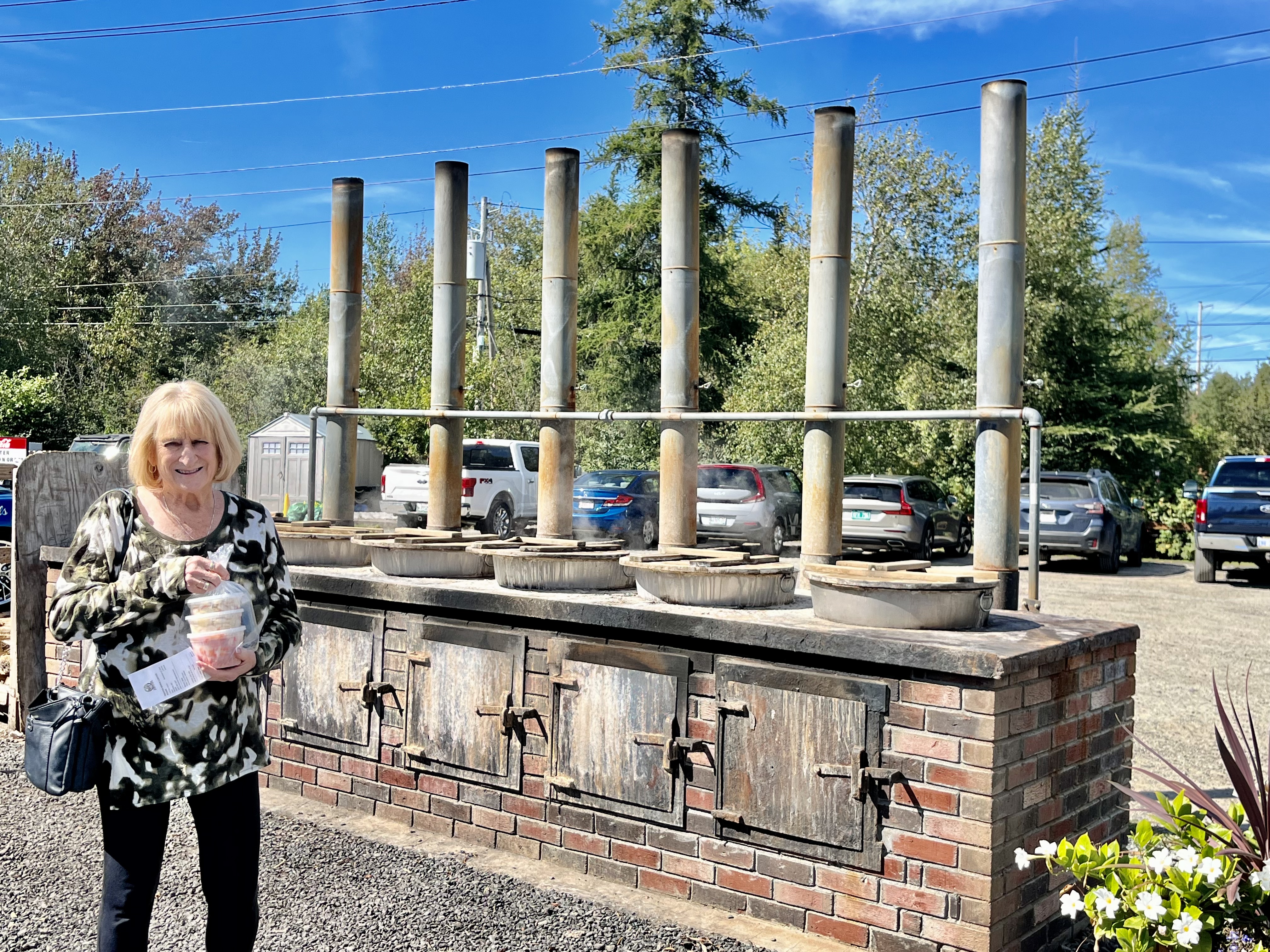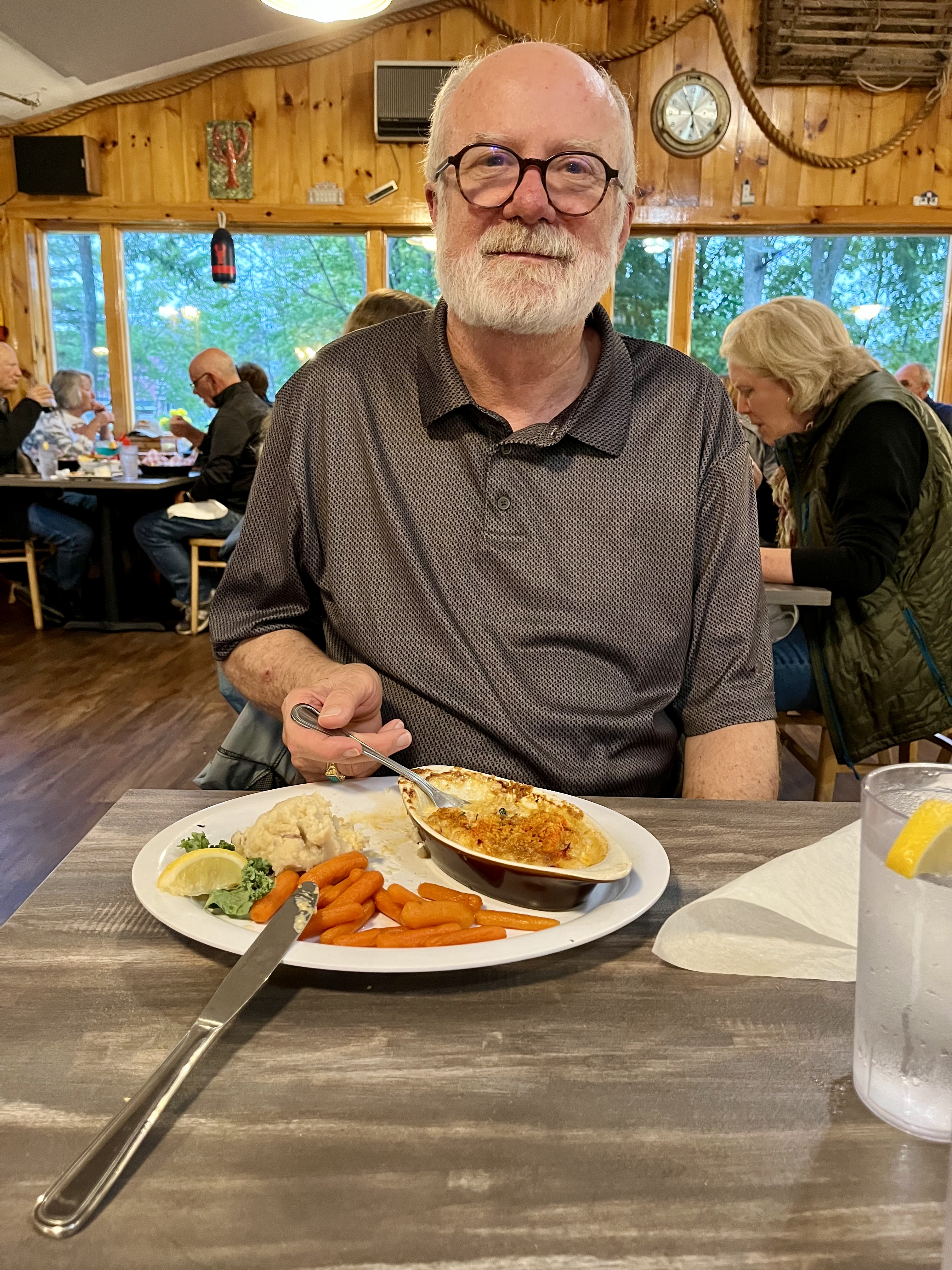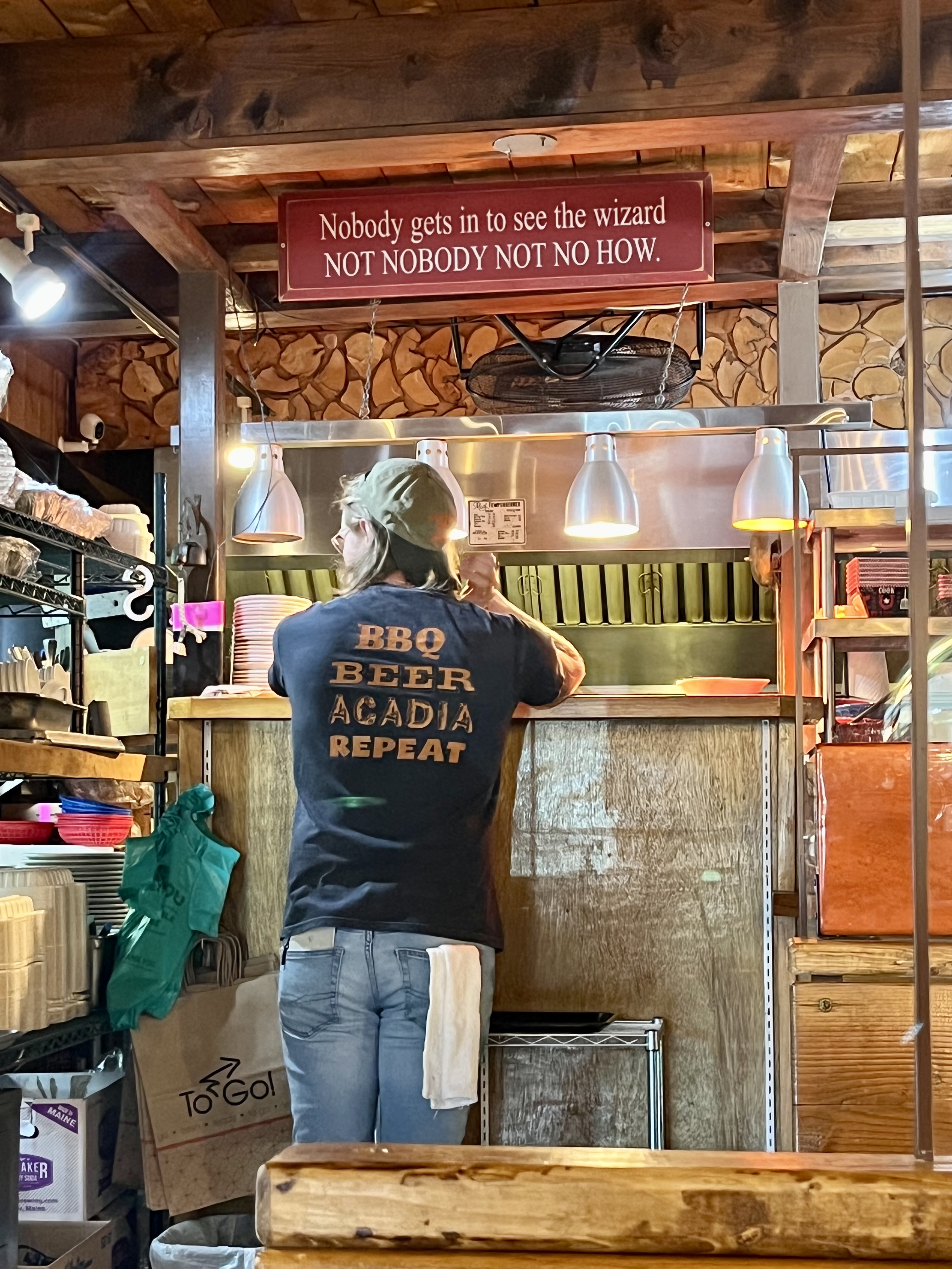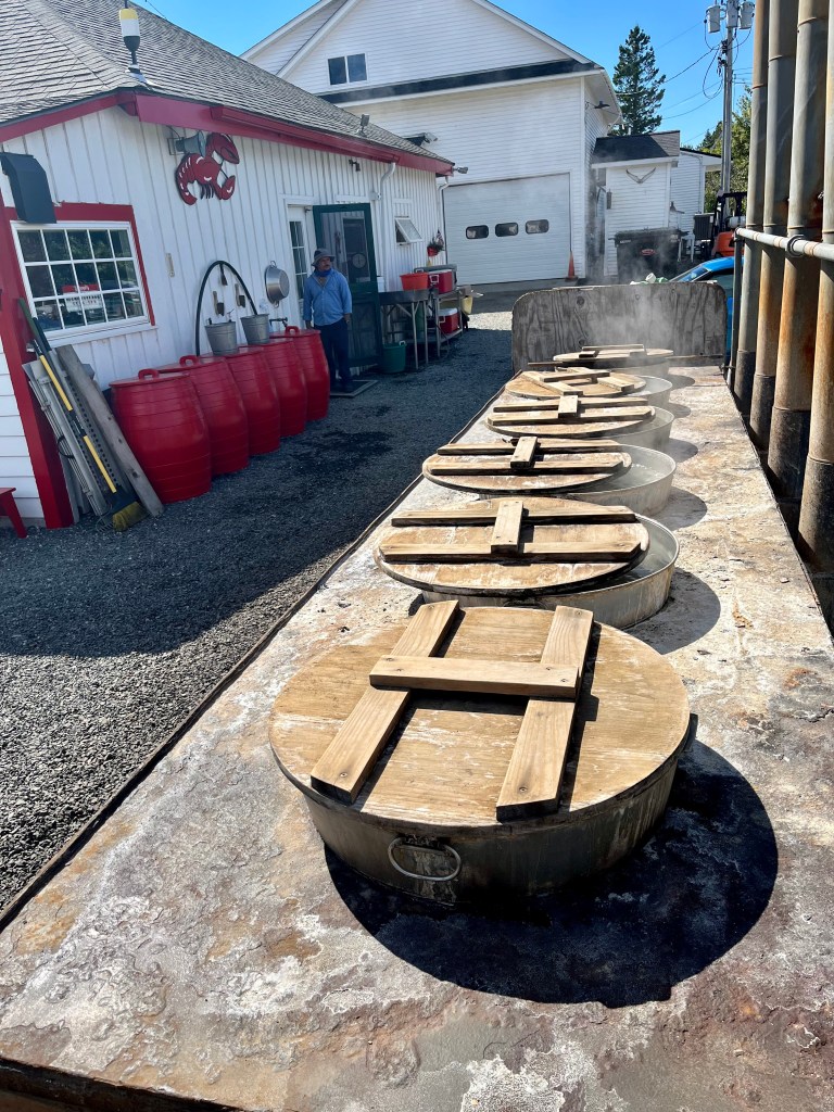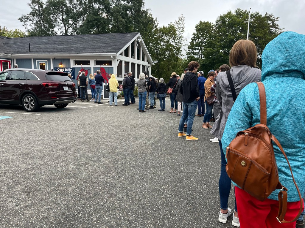 This is a line of people standing in the rain waiting for the Union River Lobster Pot to open.